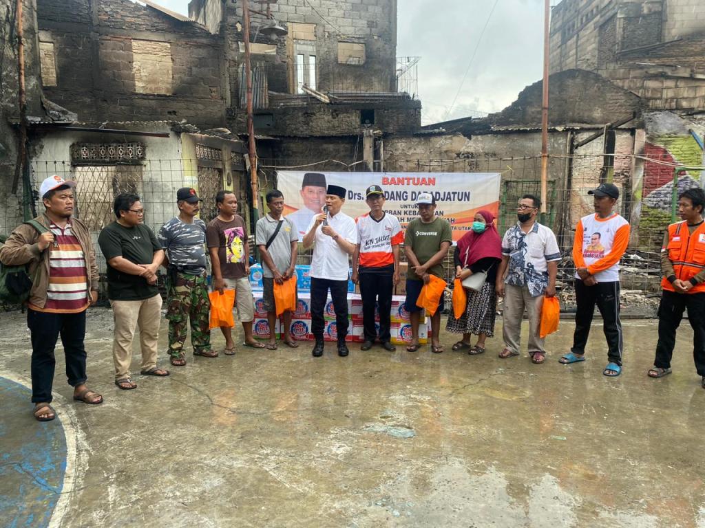 Selain itu, Adang juga memberikan paket (bingkisan) berupa Susu, Air Mineral, Biscuit, Roti, Pop Mie, kepada warga RW 01 sebanyak 500 paket warga kampung tanah merah yang terkena dampak dan korban kebakaran pipa Pertamina kepada Bapak Agung Wiguna.