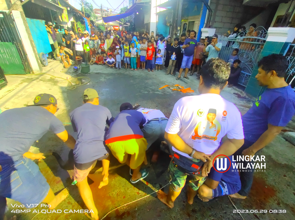Lingkar Wilayah, Jakarta Utara – Remaja Wilayah Sawah Baru RW 011 bekerjasama dengan DKM Musholla Nurul Falah pada perayaan Hari Raya Idul Adha Tahun ini yang jatuh pada tanggal 29 Juni 2023 melakukan pemotongan hewan qurban bertempat dihalaman musholla Nurul Falah. Pemotongan dilakukan oleh panitia qurban dan dihadiri oleh para tokoh dan masyarakat wilayah sekitar.