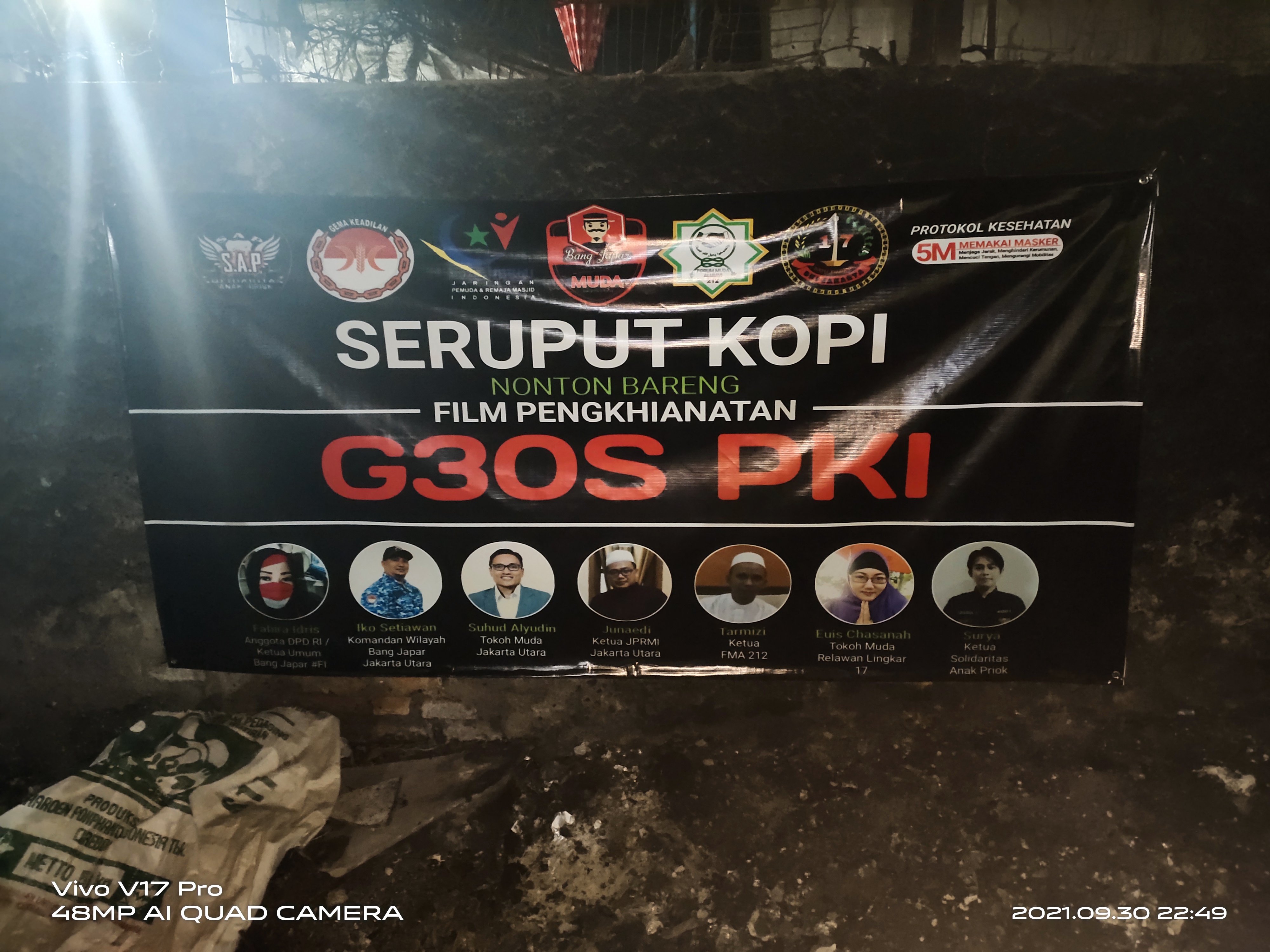 Jakarta, Lingkar Wilayah – Ormas Kebangkitan Jawara dan Pengacara (Bang Japar) Muda menggelar “Nonton Bareng” (Nobar) film G30 S PKI, Tugu Selatan, Koja, Jakarta Utara, Kamis, 30/9/2021.